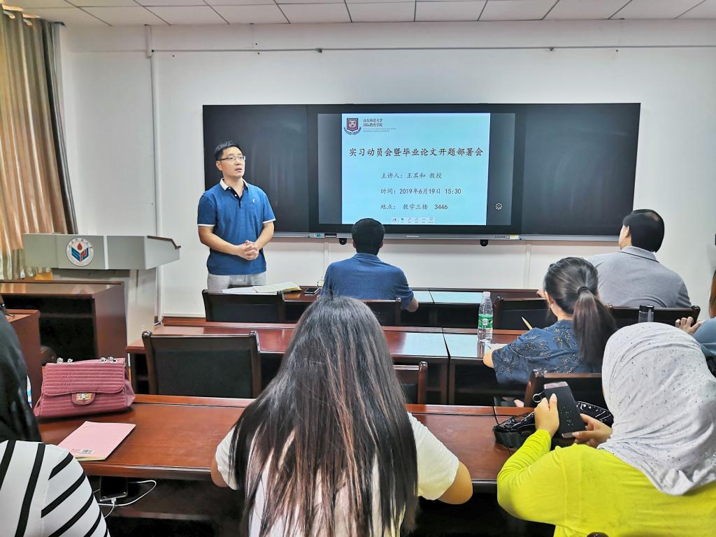 6月19日下午,國際教育學(xué)院在千佛山校區(qū)教學(xué)三樓3446會(huì)議室舉行2018級(jí)中外漢碩研究生實(shí)習(xí)動(dòng)員大會(huì)暨畢業(yè)論文開題部署會(huì)。學(xué)院黨總支副書記孫全志、留學(xué)生教育系主任常慶豐和2018級(jí)全體中外漢碩研究生參加本次會(huì)議。會(huì)議由國際教育學(xué)院副院長王其和教授主持。
