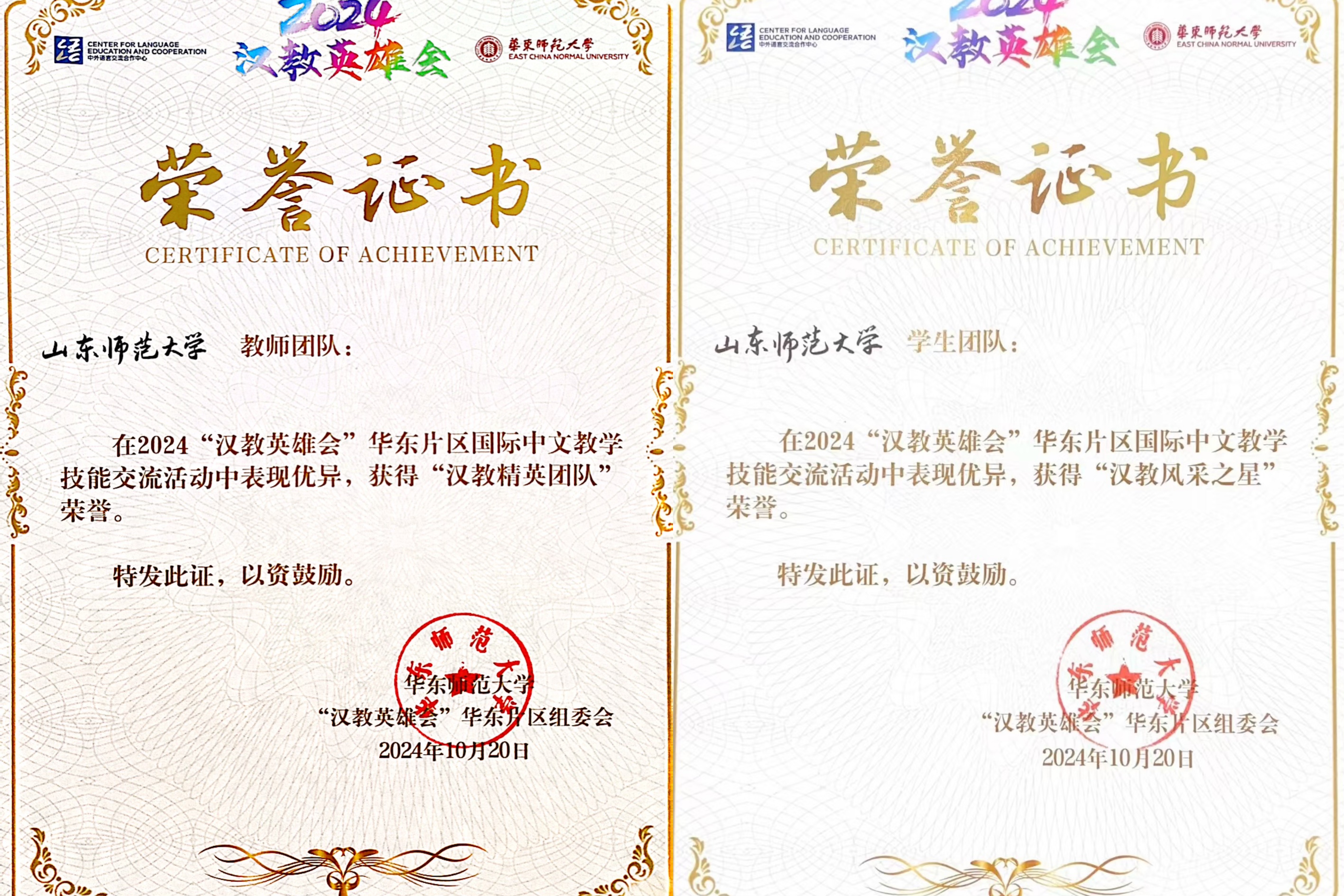 2024年10月19-20日,由教育部中外語言合作交流中心、全國漢語國際教育專業(yè)學(xué)位研究生教育指導(dǎo)委員會聯(lián)合主辦的2024年“漢教英雄會”華東片區(qū)國際中文教學(xué)技能線下交流活動在華東師范大學(xué)舉辦。我校國際教育學(xué)院和文學(xué)院師生聯(lián)合組成教師隊(duì)、學(xué)生隊(duì)參加此次活動,其中教師隊(duì)是我校首次參加該項(xiàng)活動并由文學(xué)院鄒強(qiáng)副院長帶領(lǐng),學(xué)生隊(duì)由國際教育學(xué)院盛蕾老師帶領(lǐng)。經(jīng)過激烈角逐,教師隊(duì)從 7 組參賽高校中脫穎而出,獲得“漢教精英團(tuán)隊(duì)” 稱號;學(xué)生隊(duì)從 20 組參賽高校中嶄露頭角,榮獲“漢教風(fēng)采之星” 稱號。