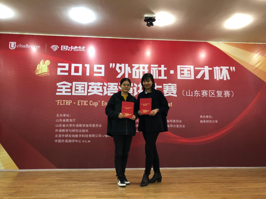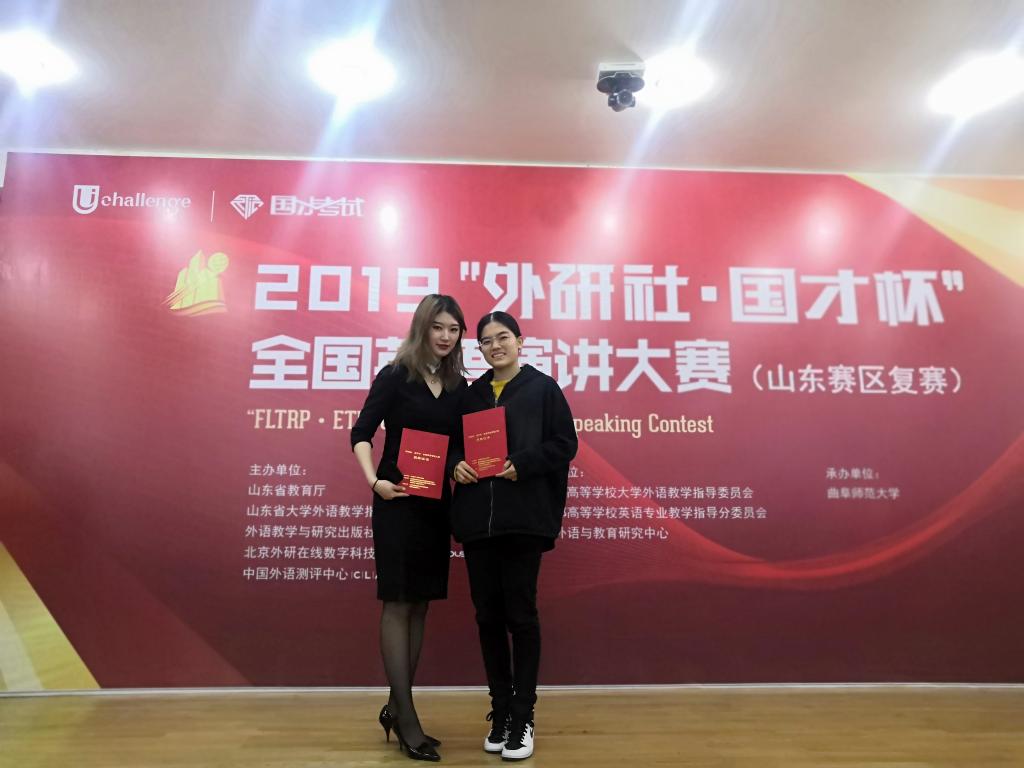 10月27日,由山東省教育廳、山東省大學(xué)外語教學(xué)指導(dǎo)委員會、外語教學(xué)與研究出版社主辦,教育部高等學(xué)校大學(xué)外語教學(xué)指導(dǎo)委員會、教育部高等學(xué)校英語專業(yè)教學(xué)指導(dǎo)分委員會、中國外語與教育研究中心合辦、曲阜師范大學(xué)承辦的2019“外研社·國才杯”全國英語演講、閱讀、寫作大賽(山東賽區(qū)復(fù)賽),經(jīng)過兩天的激烈角逐在曲阜師范大學(xué)圓滿落幕。我院李群老師指導(dǎo)的17級漢語國際教育專業(yè)的樸思蒙、李雨桐兩位同學(xué)分別榮獲演講大賽一等獎以及寫作大賽三等獎的優(yōu)異成績,李群榮獲優(yōu)秀指導(dǎo)教師稱號。