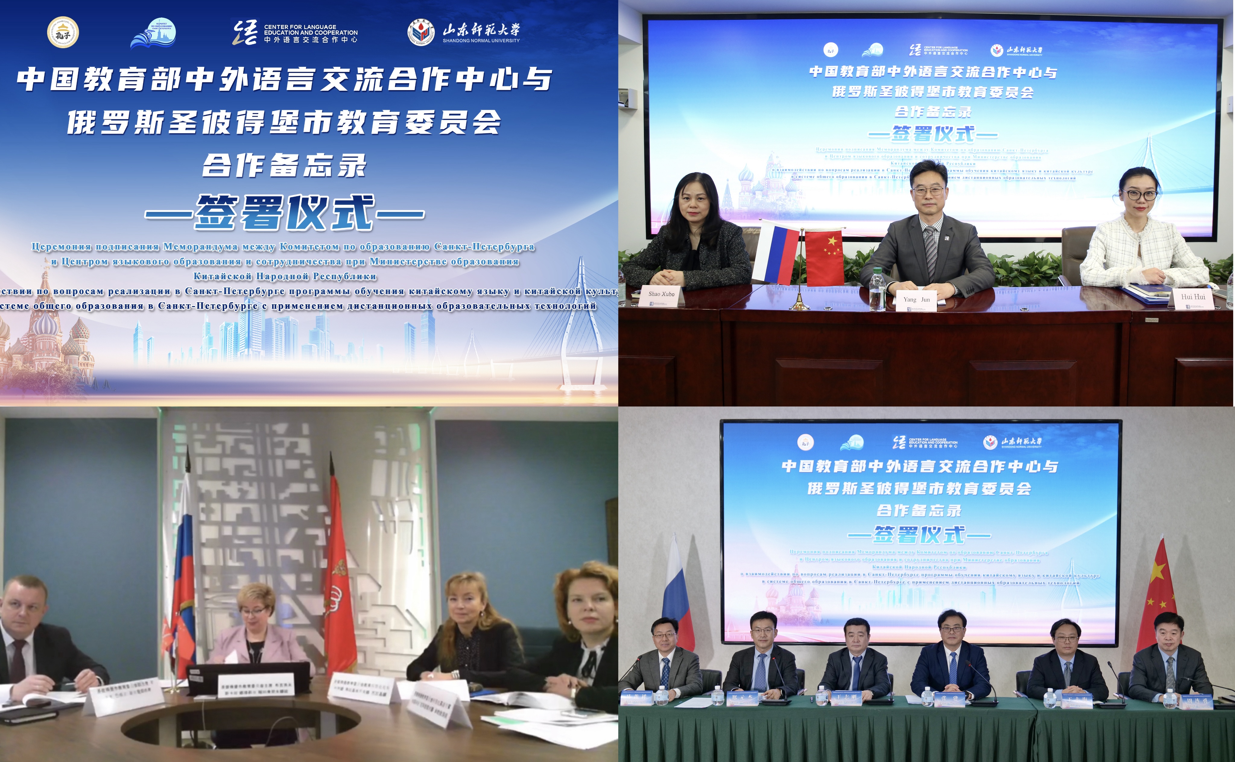2024131日,中國教育部語合中心與圣彼得堡市教育委員會簽署關(guān)于使用遠(yuǎn)程教育技術(shù)在圣彼得堡普及教育體系中開展中文與中國文化教學(xué)的備忘錄簽署儀式在線上舉行。中外語言交流合作中心副主任楊軍,俄羅斯圣彼得堡市教育委員會主席布吉洛夫斯卡婭·娜塔莉亞、副主席羅澤夫·巴維爾、師資處處長巴拉金娜·葉蓮娜、師資處高級專家米哈伊洛娃·娜塔莉亞,山東省教育廳總督學(xué)王志剛,山東師范大學(xué)校長張建、副校長鄭元杰,俄羅斯圣彼得堡“孔子”東方語言文化學(xué)院院長張蕈麗等出席。山東省教育廳國際交流與合作處、山東師范大學(xué)國際交流與合作處、國際教育學(xué)院負(fù)責(zé)人參加儀式。儀式由鄭元杰教授主持。