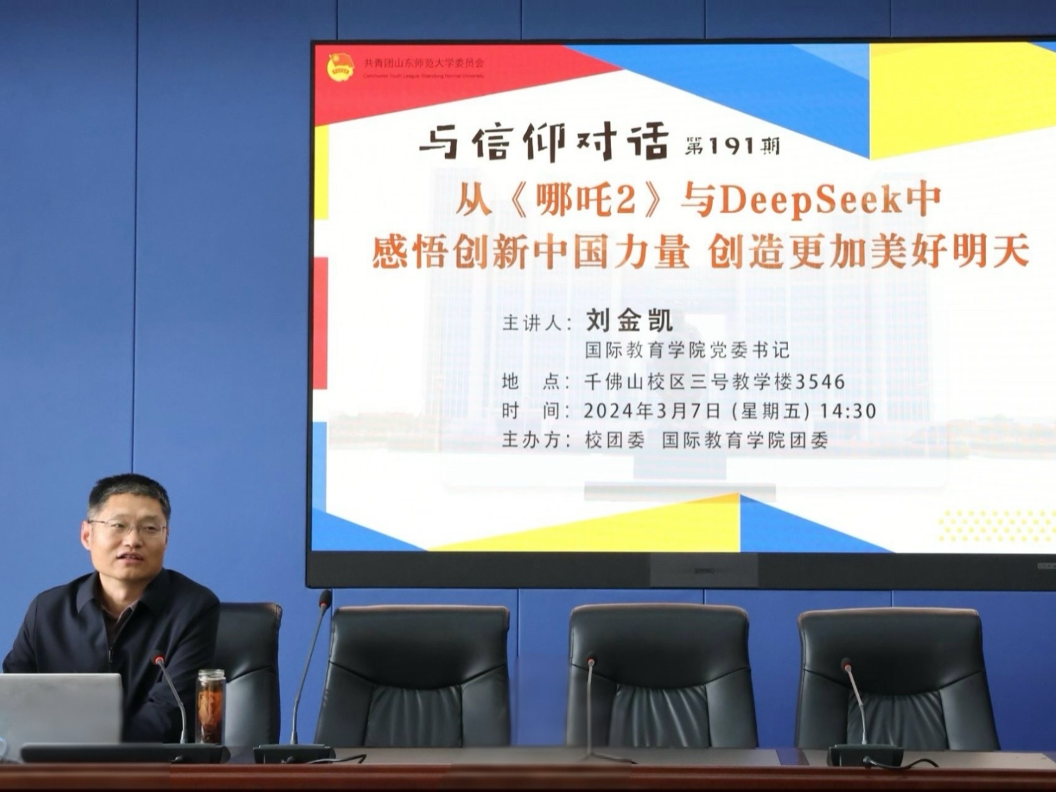 3月7日下午,校團委、國際教育學(xué)院團委聯(lián)合舉辦的第191期“與信仰對話”主題報告會于千佛山校區(qū)教學(xué)三樓3546會議室舉行,國際教育學(xué)院黨委書記劉金凱擔(dān)任主講人,2024級全體本科生到場參會。