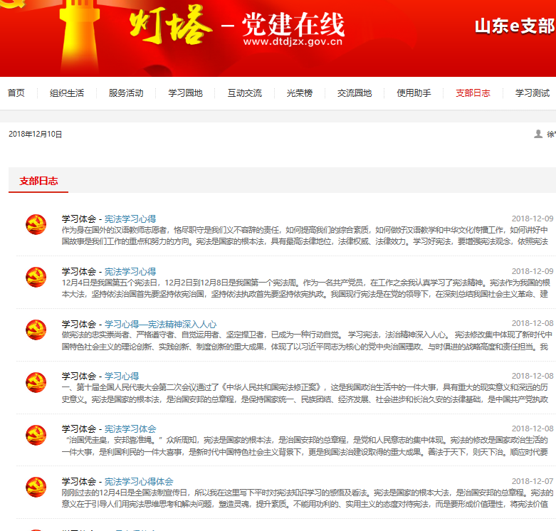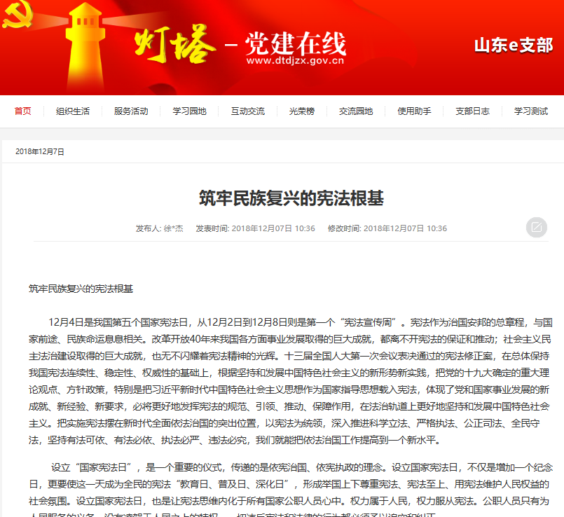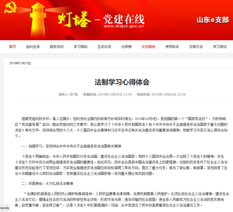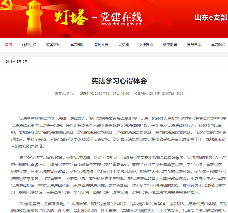 12月2日,學(xué)校黨委辦公室 校長辦公室印發(fā)《關(guān)于深入學(xué)習(xí)宣傳和貫徹實(shí)施憲法的工作方案》的通知(山東師大黨辦字〔2018〕17號),國際教育學(xué)院研究生黨支部高度重視,及早動員部署,推薦共產(chǎn)黨網(wǎng):中華人民共和國憲法專題學(xué)習(xí)網(wǎng)站http://www.12371.cn/special/xfxza/,全體黨員認(rèn)真學(xué)習(xí),撰寫學(xué)習(xí)體會,提交到燈塔E支部一起分享學(xué)習(xí)心得,增強(qiáng)了法治觀念,樹立了憲法意識,學(xué)習(xí)效果顯著。
