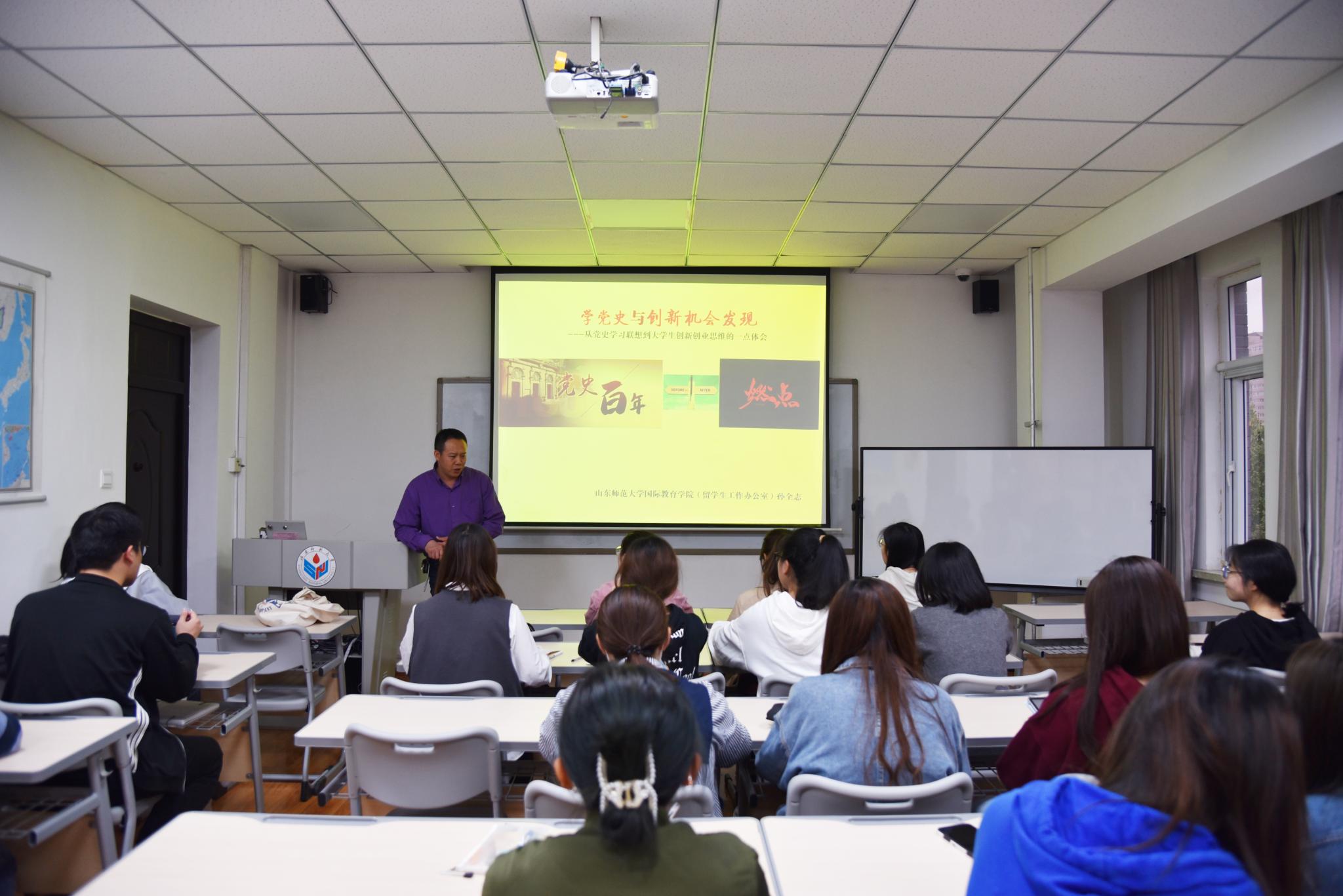 4月16日晚,國際教育學(xué)院于3538教室舉辦“學(xué)黨史與創(chuàng)新機(jī)會發(fā)現(xiàn)”專題講座。本次講座由學(xué)院黨委副書記、留學(xué)生工作辦公室主任孫全志主講,大學(xué)生創(chuàng)新創(chuàng)業(yè)項(xiàng)目成員及感興趣的同學(xué)到場學(xué)習(xí)。