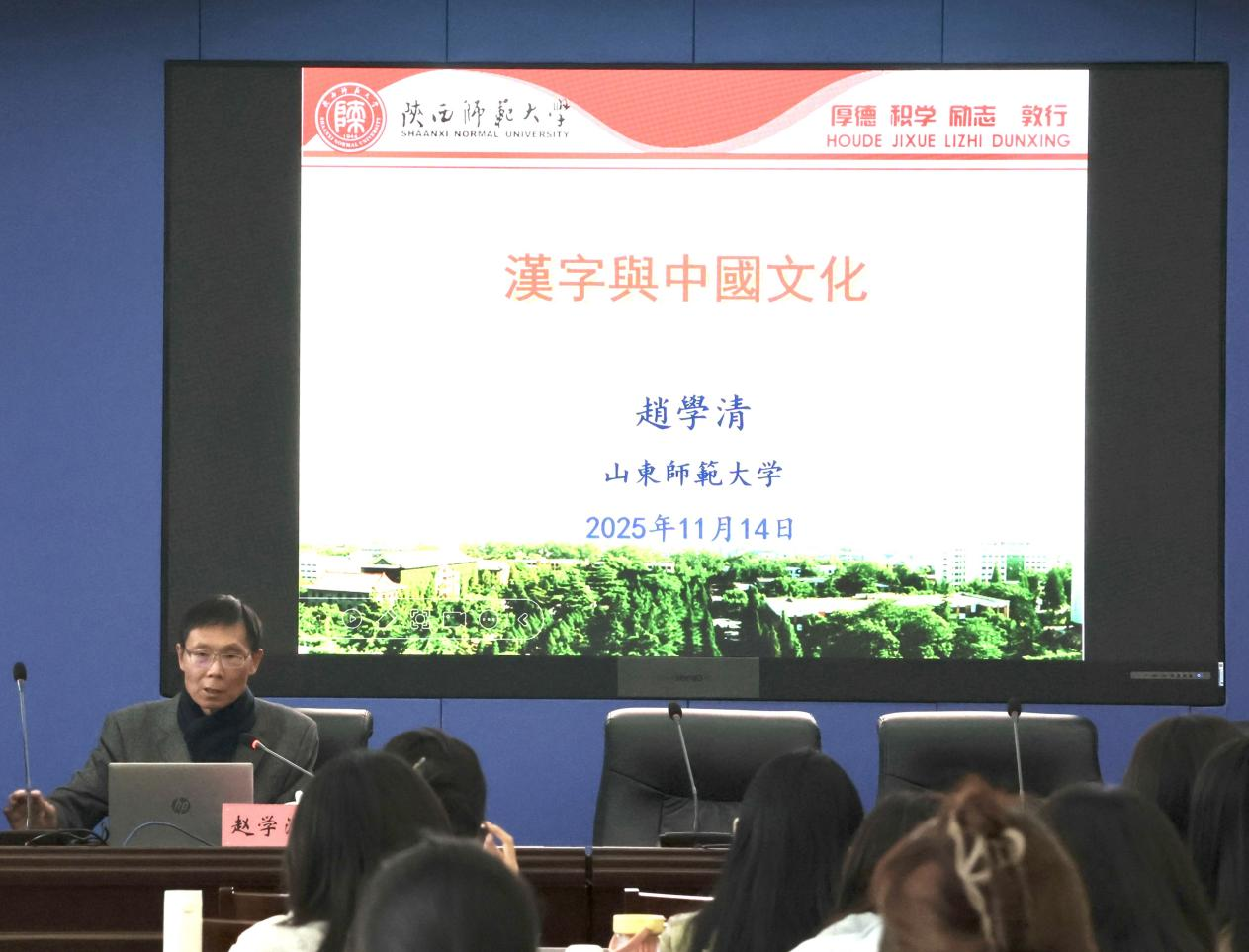 11月14日,由社會科學(xué)處、國際教育學(xué)院主辦的學(xué)術(shù)講壇于千佛山校區(qū)教學(xué)三樓3543會議室舉辦。陜西師范大學(xué)文學(xué)院趙學(xué)清教授應(yīng)邀作題為“漢字與中國文化”的學(xué)術(shù)講座,國際教育學(xué)院、文學(xué)院部分師生參加講座,講座由國際教育學(xué)院副院長王其和主持。