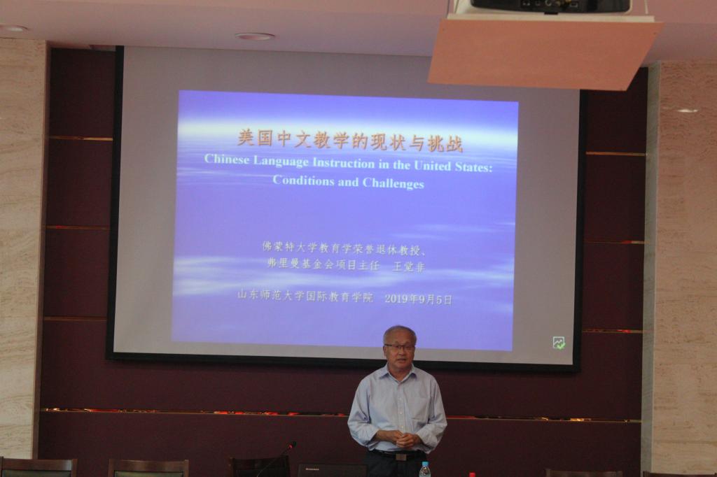 9月5日下午,美國(guó)佛蒙特大學(xué)教育學(xué)榮譽(yù)教授、弗里曼基金會(huì)項(xiàng)目主任王覺非教授應(yīng)國(guó)際教育學(xué)院邀請(qǐng),在千佛山校區(qū)3155報(bào)告廳作了題為“美國(guó)中文教學(xué)的現(xiàn)狀與挑戰(zhàn)”的學(xué)術(shù)講座。國(guó)際教育學(xué)院院長(zhǎng)馬茂祥、部分業(yè)務(wù)教師以及2019級(jí)全體碩士研究生、留學(xué)生參加了此次講座。講座由副院長(zhǎng)王其和教授主持。
