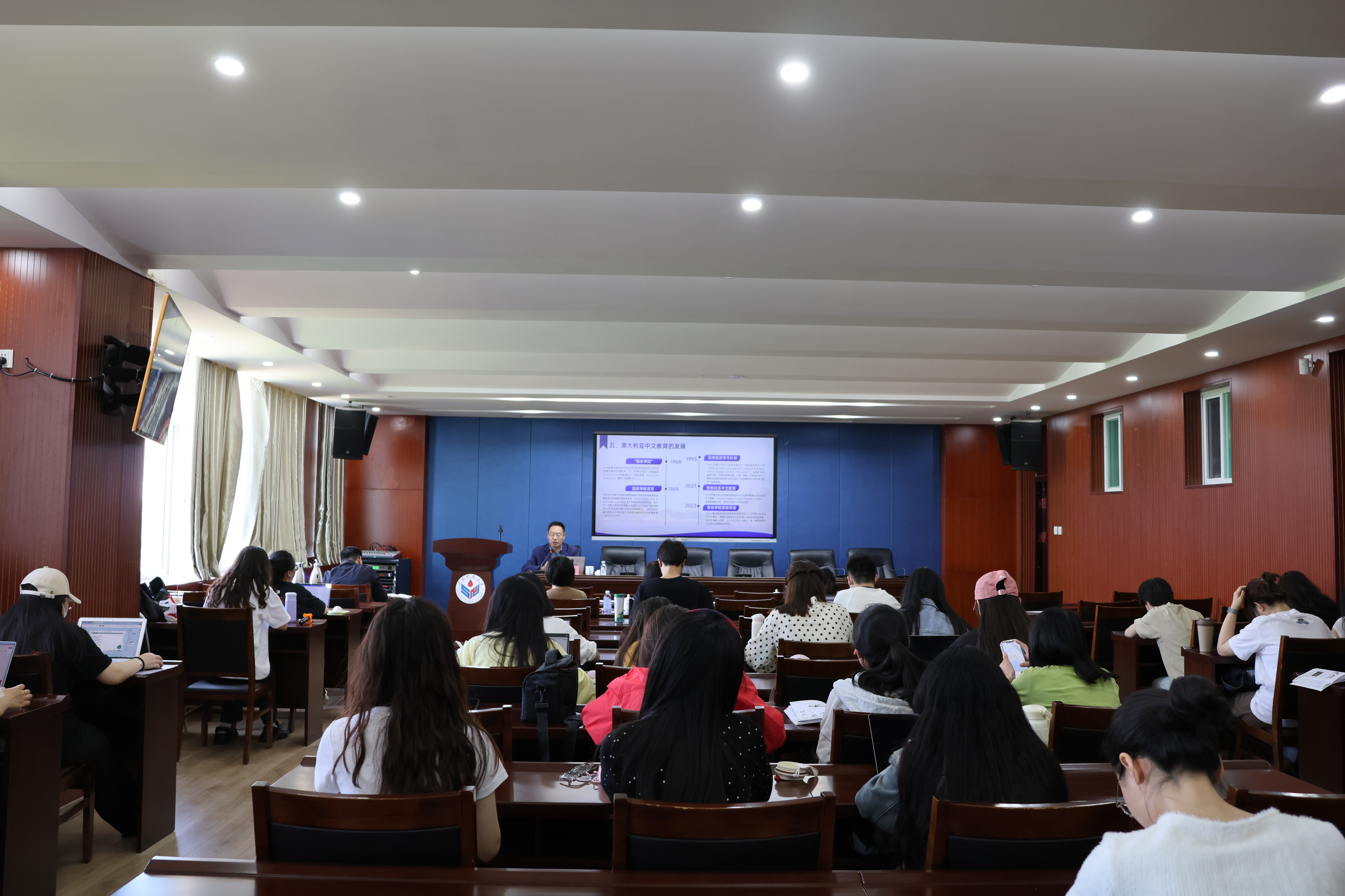 本次講座以歷史與人物相結(jié)合,材料與觀點(diǎn)相結(jié)合,敘述與評(píng)析相結(jié)合的原則追溯、考據(jù)和詮釋澳大利亞華文教育、中文教學(xué)和社區(qū)語(yǔ)言的發(fā)生、發(fā)展、現(xiàn)狀、走向及特色,圖文并茂,精彩紛呈,既開闊學(xué)院師生的國(guó)際視野,又深化了大家對(duì)澳大利亞語(yǔ)言政策和中文教育的認(rèn)識(shí)。