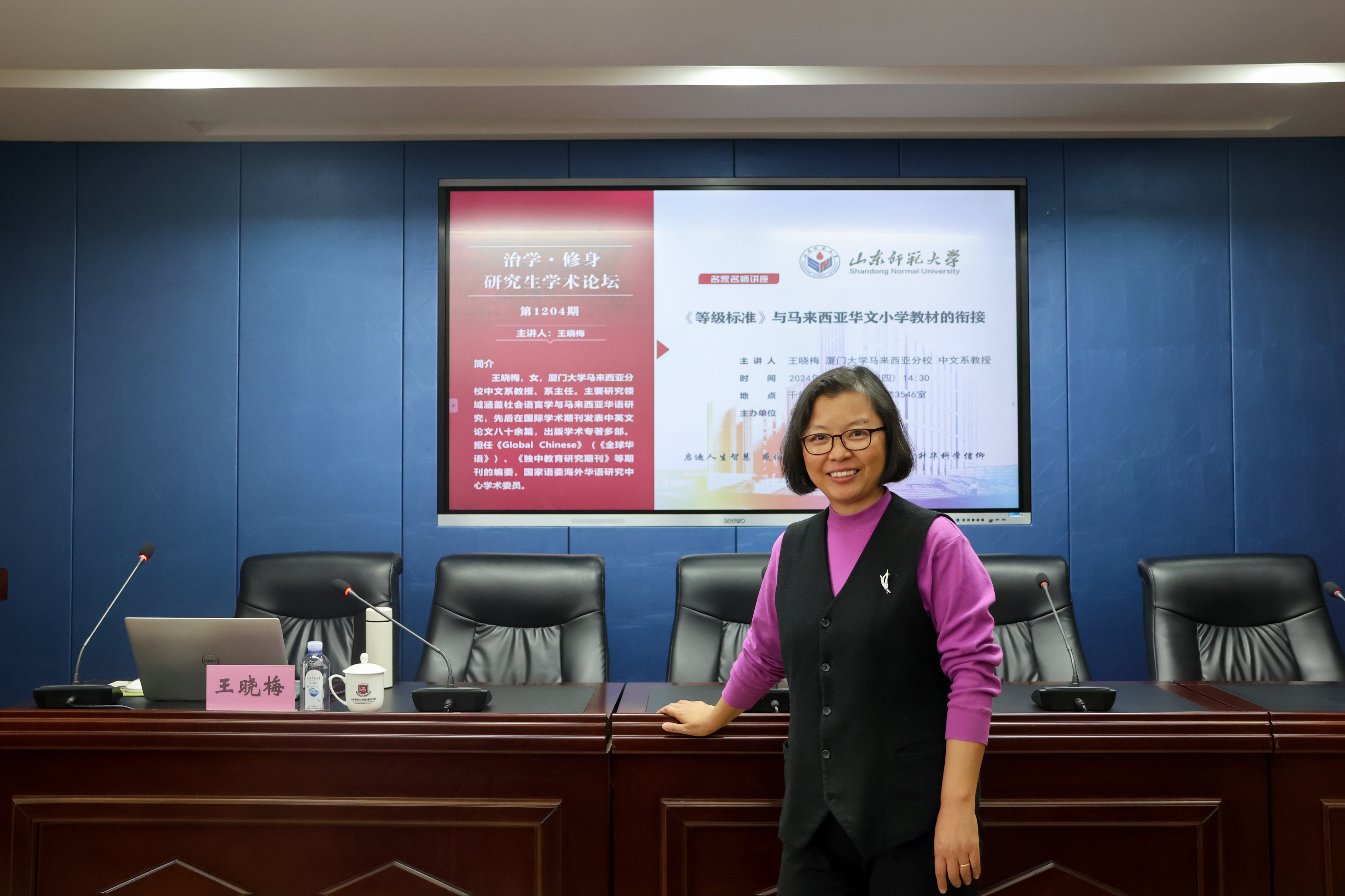 3月14日,由國際教育學(xué)院和研究生院共同主辦的學(xué)術(shù)講壇于千佛山校區(qū)教學(xué)三樓3546報告廳舉辦。廈門大學(xué)馬來西亞分校王曉梅教授應(yīng)邀為我院師生作題為“《等級標(biāo)準(zhǔn)》與馬來西亞華文小學(xué)教材的銜接”的學(xué)術(shù)講座。