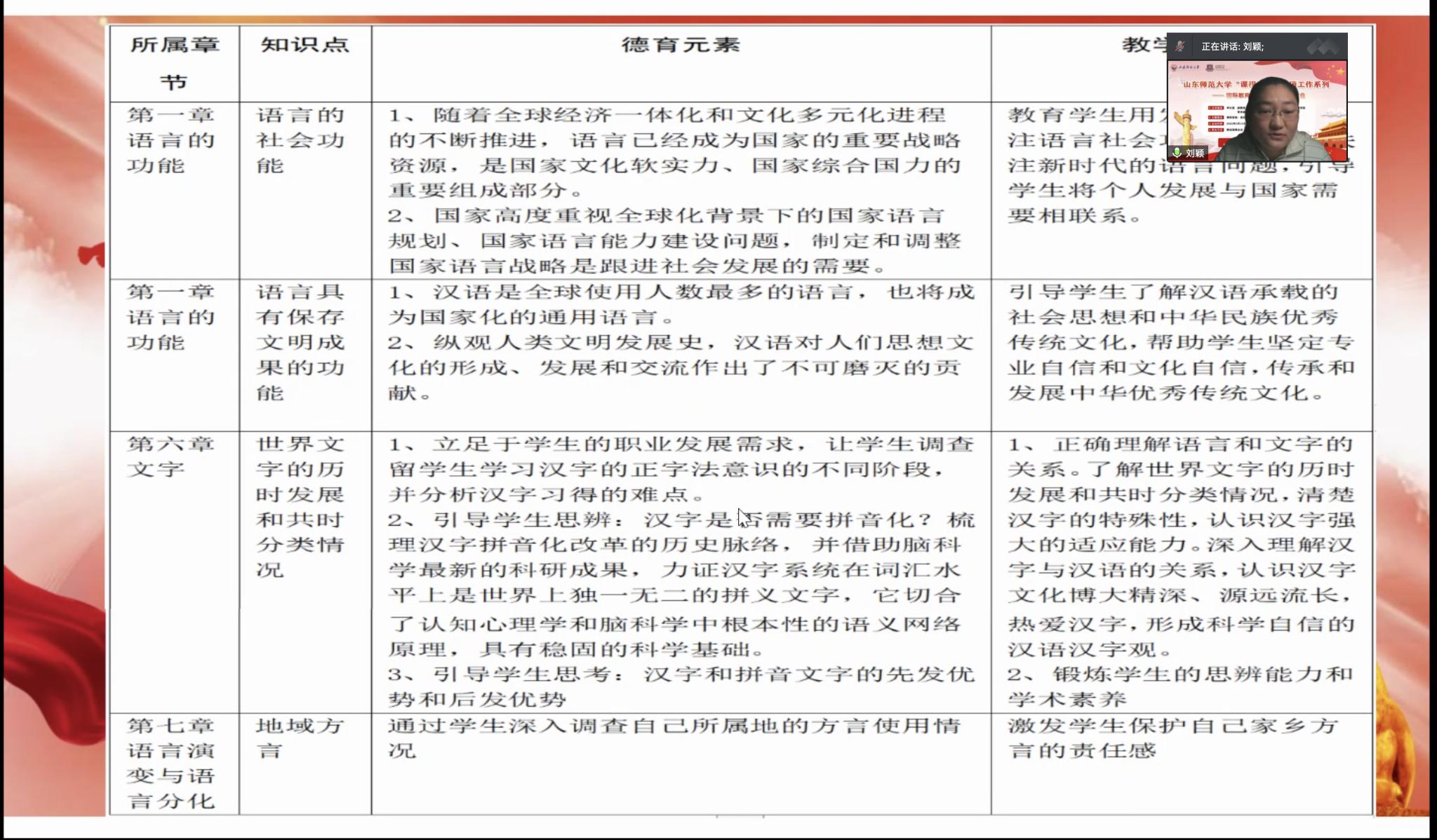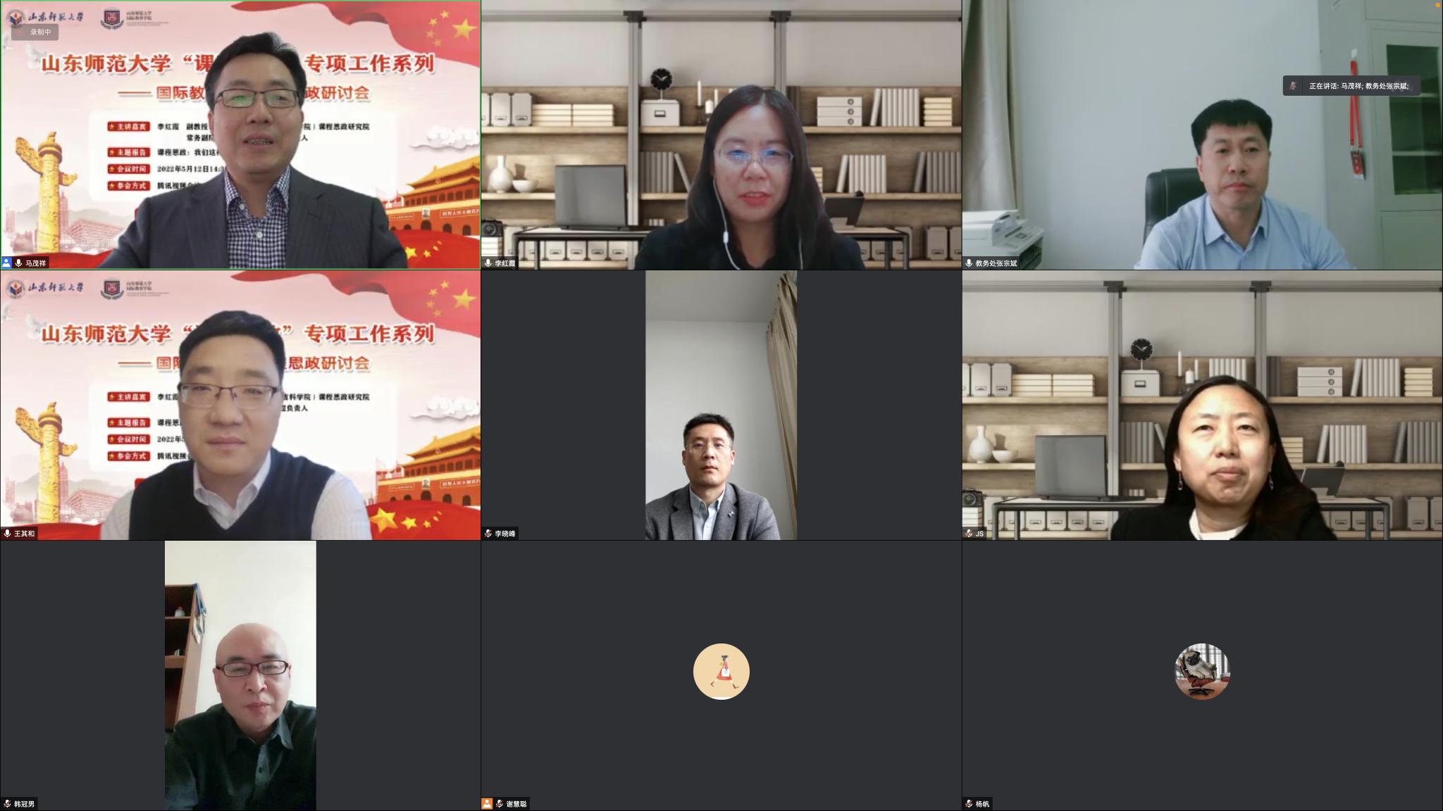 為深入貫徹落實(shí)教育部《高等學(xué)校課程思政建設(shè)指導(dǎo)綱要》,全面推進(jìn)課程思政建設(shè),提升“課程思政”育人功效與人才培養(yǎng)質(zhì)量,完善課程思政人才培養(yǎng)體系,根據(jù)教務(wù)處、課程思政教學(xué)研究中心的統(tǒng)一部署和安排,5月12日下午,國(guó)際教育學(xué)院邀請(qǐng)齊魯工業(yè)大學(xué)(山東省科學(xué)院)課程思政研究院常務(wù)副院長(zhǎng)李紅霞做“課程思政:我們這樣設(shè)計(jì)”線上經(jīng)驗(yàn)分享研討會(huì)。會(huì)議由國(guó)際教育學(xué)院馬茂祥院長(zhǎng)主持,教務(wù)處處長(zhǎng)張宗斌、國(guó)際教育學(xué)院副院長(zhǎng)王其和、校教學(xué)督導(dǎo)組史潔教授、留學(xué)生教育系主任常慶豐、漢語(yǔ)國(guó)際教育系主任鄭翠、語(yǔ)言文化教研室主任劉艷平、對(duì)外漢語(yǔ)教研室主任盛蕾、工作室全體成員以及全體專(zhuān)任教師和人民網(wǎng)記者等參加了研討會(huì)。