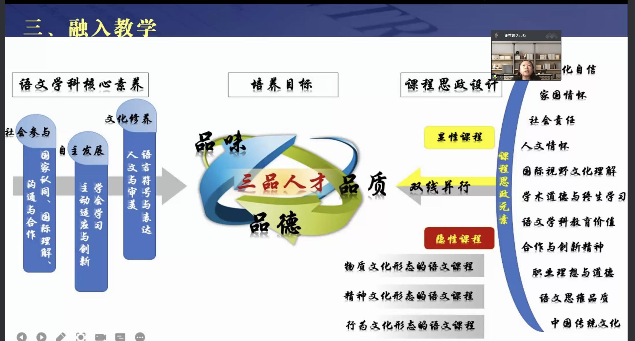 校督導(dǎo)史潔教授結(jié)合漢語(yǔ)國(guó)際教育專(zhuān)業(yè)特點(diǎn),從整體的專(zhuān)業(yè)構(gòu)思上分析了課程思政改革的思路和實(shí)踐路徑。史潔教授從明確理念、構(gòu)建體系與融入教學(xué)三個(gè)方面詳細(xì)分析了學(xué)院專(zhuān)業(yè)特點(diǎn)與課程思政的特點(diǎn),指出基于專(zhuān)業(yè)人才的培養(yǎng)的目標(biāo),學(xué)院著力于“一個(gè)中心,三個(gè)基本點(diǎn)”,即從知識(shí)的傳授到能力的培養(yǎng)到價(jià)值塑造,打造屬于國(guó)際教育學(xué)院的專(zhuān)業(yè)特點(diǎn)的完整的內(nèi)循環(huán)結(jié)構(gòu),由賦能到具體的落實(shí)能力培養(yǎng)到深化價(jià)值塑造,完成學(xué)生對(duì)中國(guó)精神、國(guó)際話語(yǔ)和職業(yè)追求的理解與深化。針對(duì)國(guó)際教育學(xué)院中國(guó)學(xué)生群體與外國(guó)留學(xué)生群體的培養(yǎng),結(jié)合《漢語(yǔ)國(guó)際教育概論》《語(yǔ)文學(xué)科教學(xué)論》課程思政建設(shè)的案例,提出了課程思政建設(shè)的思路以及分別制定課程思政的人才培養(yǎng)體系的計(jì)劃,要求明確目標(biāo),落實(shí)兩種教育同向同行,抓牢顯性教育與隱形教育相互融合的目的,確立“品位高雅、品德高尚、品質(zhì)優(yōu)美”的具有國(guó)際視野、跨文化能力強(qiáng)、中國(guó)交流與傳播能力的三品人才。