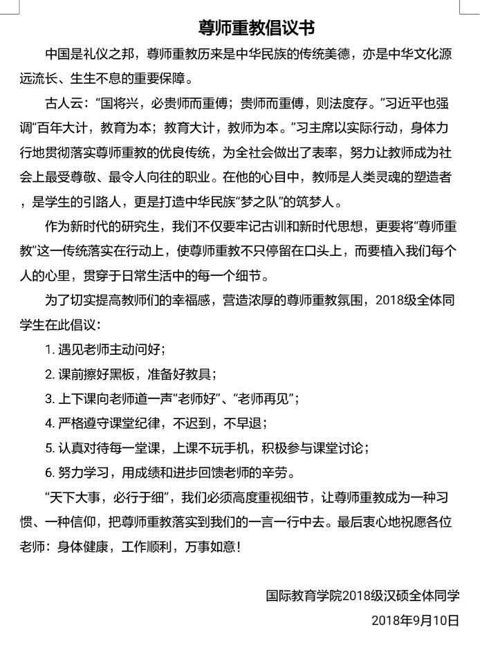 秋風(fēng)颯爽,金陽怡悅,在這樣一個(gè)清朗的時(shí)節(jié)里國際教育學(xué)院2018級(jí)全體研究生于9月10日開展了以“尊師重教樹文風(fēng)”為主題的教師節(jié)活動(dòng)。