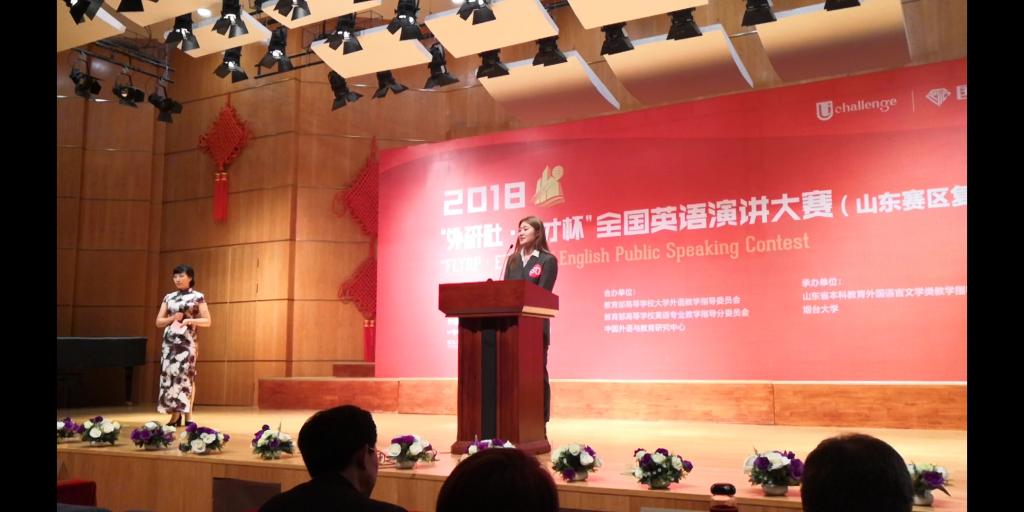 本次演講大賽設(shè)特等獎(jiǎng)3名,一等獎(jiǎng)6名,二等獎(jiǎng)9名、三等獎(jiǎng)31名。特等獎(jiǎng)獲獎(jiǎng)選手將代表山東賽區(qū)赴北京參加全國(guó)總決賽。大賽復(fù)賽環(huán)節(jié)由三輪比賽構(gòu)成:第一輪由定題演講及專家問(wèn)答兩個(gè)環(huán)節(jié)組成;第二輪由即興演講、專家問(wèn)答、文化素養(yǎng)題回答三個(gè)環(huán)節(jié)組成;第三輪為小組辯論環(huán)節(jié)。在第一輪的比賽中,樸思蒙同學(xué)憑借精心的準(zhǔn)備及扎實(shí)的英語(yǔ)功底獲得了全場(chǎng)第11名的好成績(jī),順利晉級(jí)下一輪。在第二輪的比賽中,雖以0.01分的微弱差距與一等獎(jiǎng)失之交臂,但其從容自信的演講風(fēng)格及流利地道的英語(yǔ)表達(dá)獲得了評(píng)委的一致認(rèn)可及現(xiàn)場(chǎng)的陣陣掌聲。