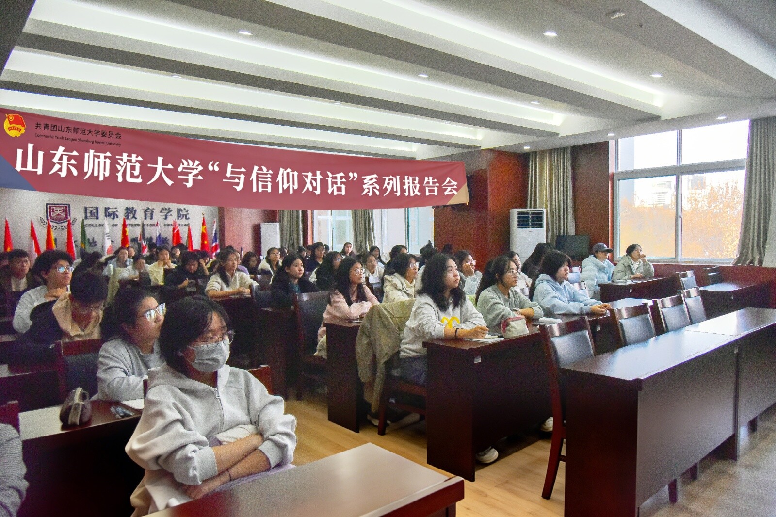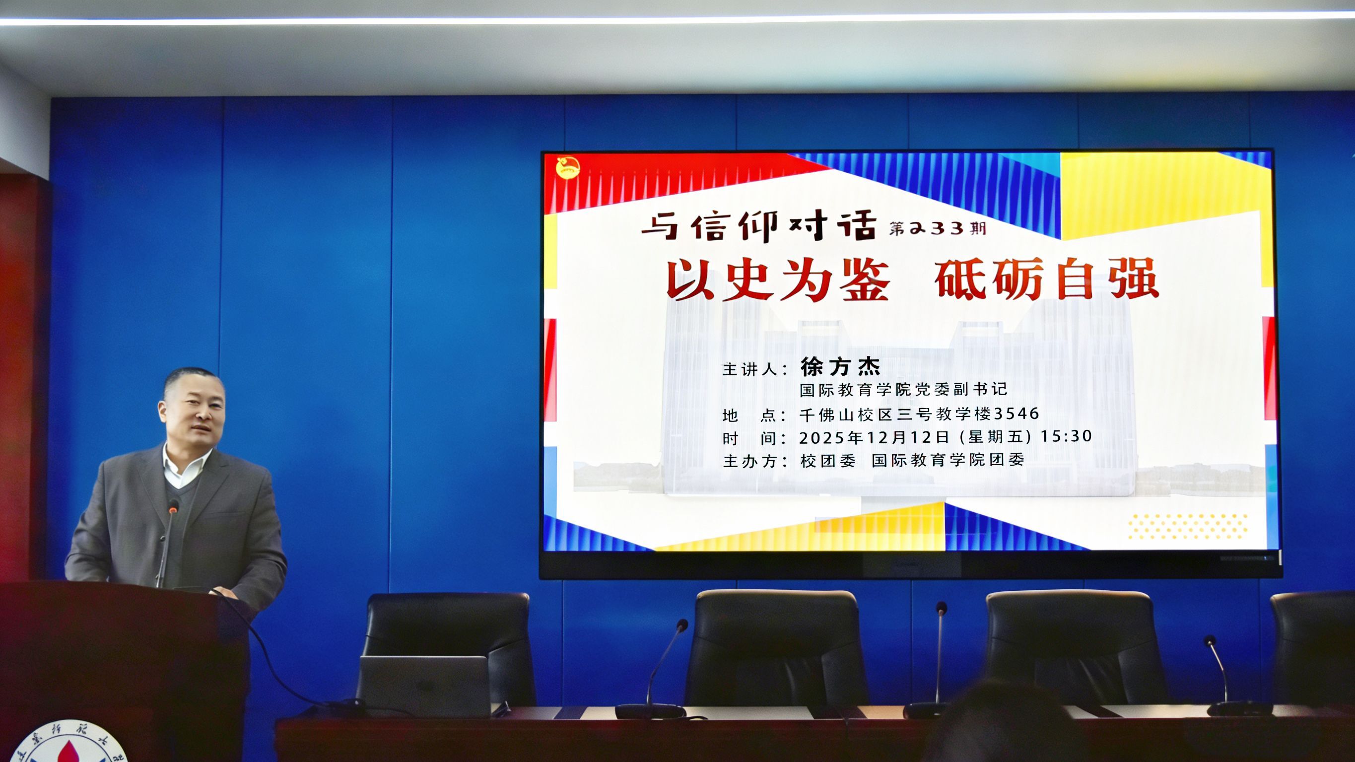 12月12日下午,校團(tuán)委、國(guó)際教育學(xué)院團(tuán)委聯(lián)合舉辦的第233期“與信仰對(duì)話”系列報(bào)告會(huì)在千佛山校區(qū)三號(hào)教學(xué)樓3546會(huì)議室舉行。國(guó)際教育學(xué)院黨委副書記徐方杰作題為“以史為鑒,砥礪自強(qiáng)”的主題報(bào)告,報(bào)告會(huì)由輔導(dǎo)員魏雪玲主持,2025級(jí)全體學(xué)生到場(chǎng)參加。
