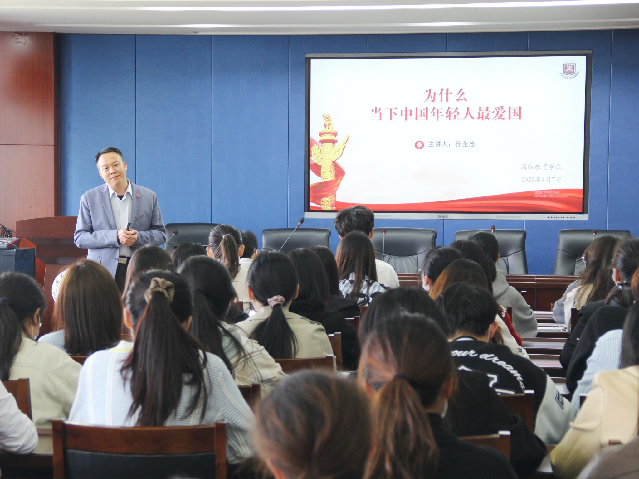 活動(dòng)伊始,孫全志書記以“為什么當(dāng)下中國(guó)年輕人最愛國(guó)”為引,帶領(lǐng)學(xué)員們初步思考新時(shí)代愛國(guó)的原因。孫書記聚焦國(guó)際發(fā)展格局,通過(guò)分析中美關(guān)系的轉(zhuǎn)變歷程、敵對(duì)勢(shì)力發(fā)動(dòng)的“顏色革命”、資本“永不停歇增值”的核心動(dòng)因等基本狀況,充分肯定了社會(huì)主義及中華民族精神的磅礴偉力。從“飯圈女孩”與“帝吧”男孩自發(fā)的反港獨(dú)愛國(guó)出征到“國(guó)有難、沖上去”廣大青年主動(dòng)堅(jiān)守抗疫一線的最美逆行,他以漫畫、詩(shī)歌、視頻等形式帶領(lǐng)學(xué)生重溫時(shí)代記憶。孫書記在接受青年學(xué)生采訪時(shí)深情感慨,青少年群體堅(jiān)定不移聽黨話、跟黨走,對(duì)共產(chǎn)黨員的公仆情懷和利他精神具有強(qiáng)烈的思想認(rèn)同和情感共鳴。隨后,孫書記系統(tǒng)闡釋了愛國(guó)的原因:一是國(guó)家的教育,二是國(guó)家的強(qiáng)大。孫書記的教誨思慮深遠(yuǎn),內(nèi)涵深刻。最后,他鼓勵(lì)同學(xué)們堅(jiān)定“四個(gè)自信”,在細(xì)照篤行中弘揚(yáng)精神譜系、厚植愛國(guó)情懷,成為成熟、務(wù)實(shí)、勇敢、擔(dān)當(dāng)?shù)那嗄晟姟?/span>