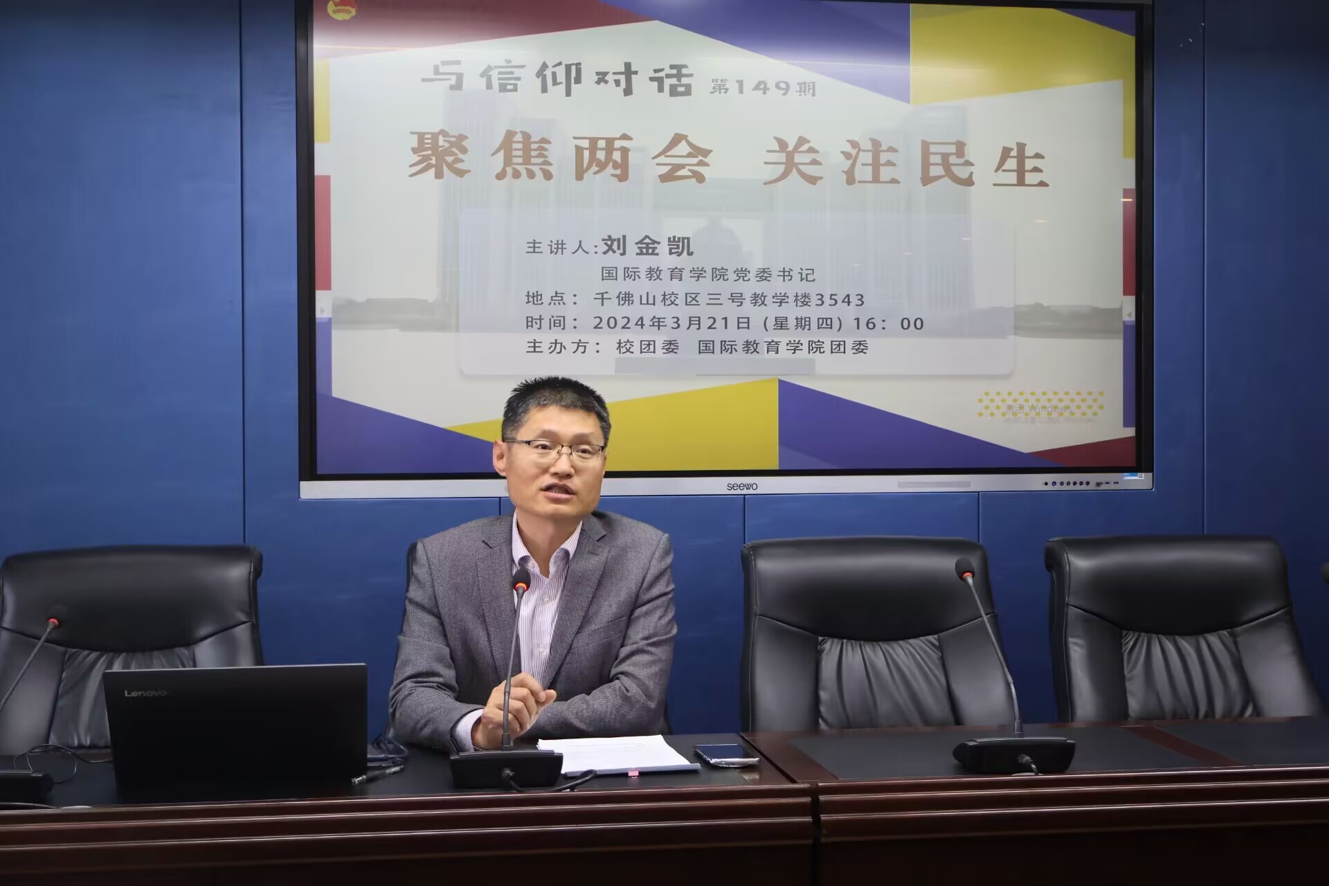 為學(xué)習(xí)貫徹全國兩會精神,加強(qiáng)學(xué)生思想政治引領(lǐng),3月21日下午,校團(tuán)委和國際教育學(xué)院團(tuán)委聯(lián)合舉辦的“聚焦兩會,關(guān)注民生”主題報告會于千佛山校區(qū)三號教學(xué)樓3546教室順利開展,本次講座由國際教育學(xué)院黨委書記劉金凱擔(dān)任主講人,學(xué)院七十余名學(xué)子到場參加。
