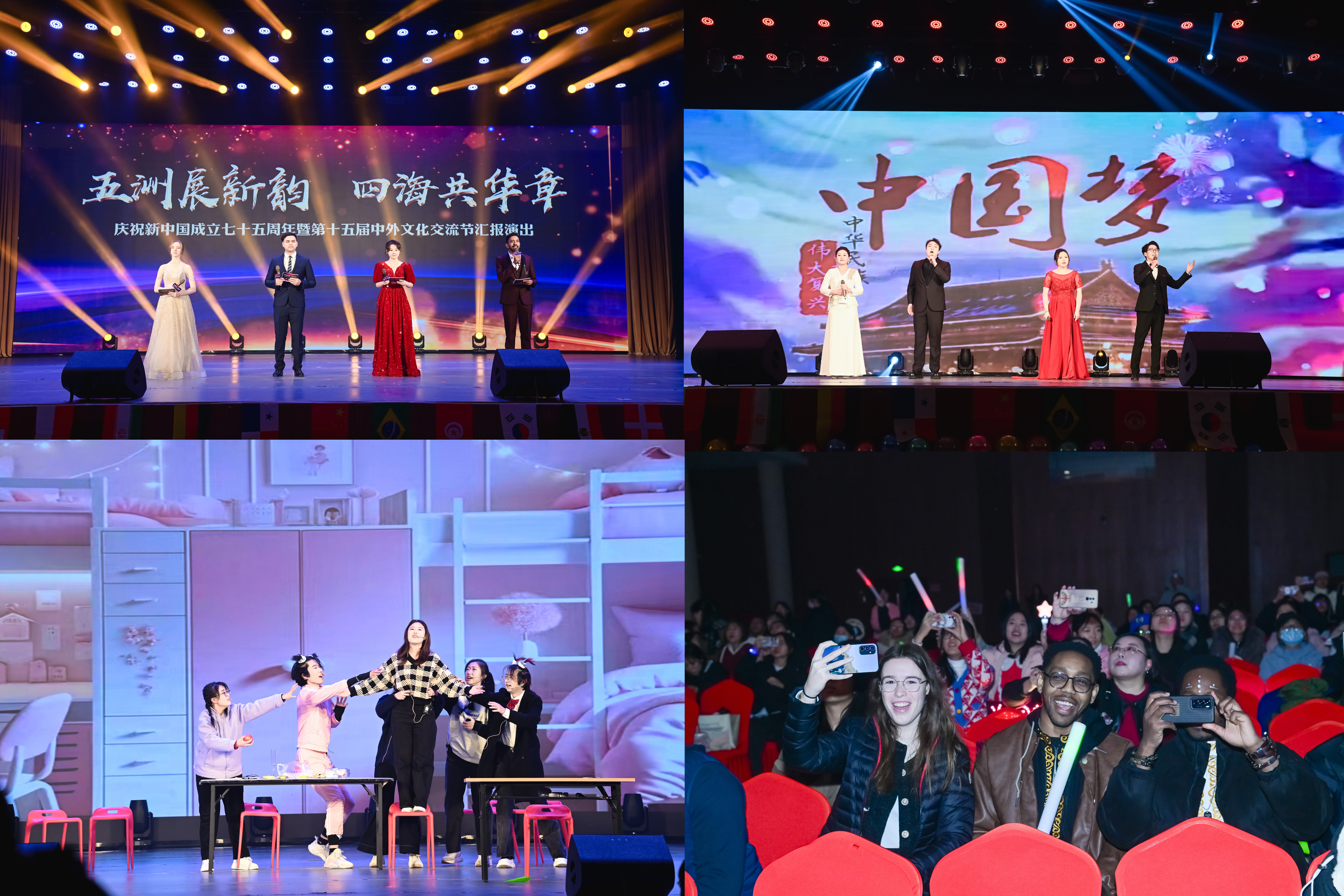 晚會主持人由來自中國、烏克蘭、斯里蘭卡、巴基斯坦的四名學(xué)生擔(dān)任。開場舞以動感歡快的節(jié)奏調(diào)動起全場的氣氛;《燈火里的中國》詞曲恢弘大氣,向世界展現(xiàn)了日新月異的美麗中國;翰叢傳統(tǒng)文藝社帶來表演《古物新觀》,古今穿梭間旗劍舞動、氣勢如虹,書畫曲裾、文韻昭昭;情景劇《文化的漣漪》《對不起,我的中文不好》則生動演繹了留學(xué)生學(xué)習(xí)中華文化的趣味與溫情;婀娜多姿的泰國舞、靈動輕盈的越南舞、韻律奔放的非洲舞分別展示了不同文化的風(fēng)姿風(fēng)采,彰顯了世界文化的多樣性;接連登場的歌曲串燒由中外學(xué)生聯(lián)袂獻(xiàn)上,悠揚(yáng)婉轉(zhuǎn);可親可敬的導(dǎo)員們與學(xué)生合作帶來舞蹈《WOW派對》,靈動的舞姿閃耀無限的魅力,熱情洋溢,活力十足,將全場的氣氛推向最高潮;舞蹈表演《東方紅》如紅日般朗照著青年學(xué)子矢志奮斗的堅定決心;小品《復(fù)活軍團(tuán)》用絲絲入扣的表演為觀眾送來無數(shù)歡笑;最后,一曲《天地龍鱗》唱響了華夏大地的壯麗山河,伴隨著對未來的美好展望,這場匯聚青春激情、跨越文化藩籬的晚會正式落幕。