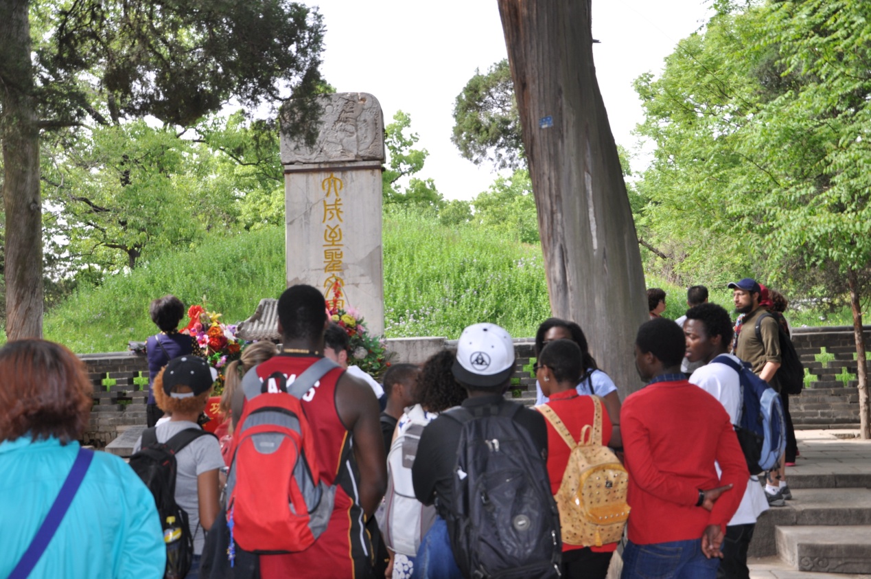 來到孔府,這座歷代“衍圣公”辦公及生活的府衙式建筑分為前廳、中居和后園。作為辦公場所的孔府前廳,彰顯著古代官衙的威嚴,中居和后園卻透露出濃濃的生活氣息,這種建筑布局也深深地觸動著留學生們,讓他們感受著中國傳統(tǒng)歷史文化的神秘。離開孔府,同學們乘車來到了1.5公里外的孔林,孔林大門又叫孔至圣林門,是一座木質(zhì)結(jié)構(gòu)的牌坊,牌樓結(jié)構(gòu)精巧,令人贊嘆,腳踏孔林“神道”,穿過孔林二門和洙水橋,經(jīng)過自貢手植楷,最終來到了孔子墓前。在導游的講解下,學生們進一步加深了對這位“大成圣至先師”的了解,對這位偉大的教育家肅然起敬。