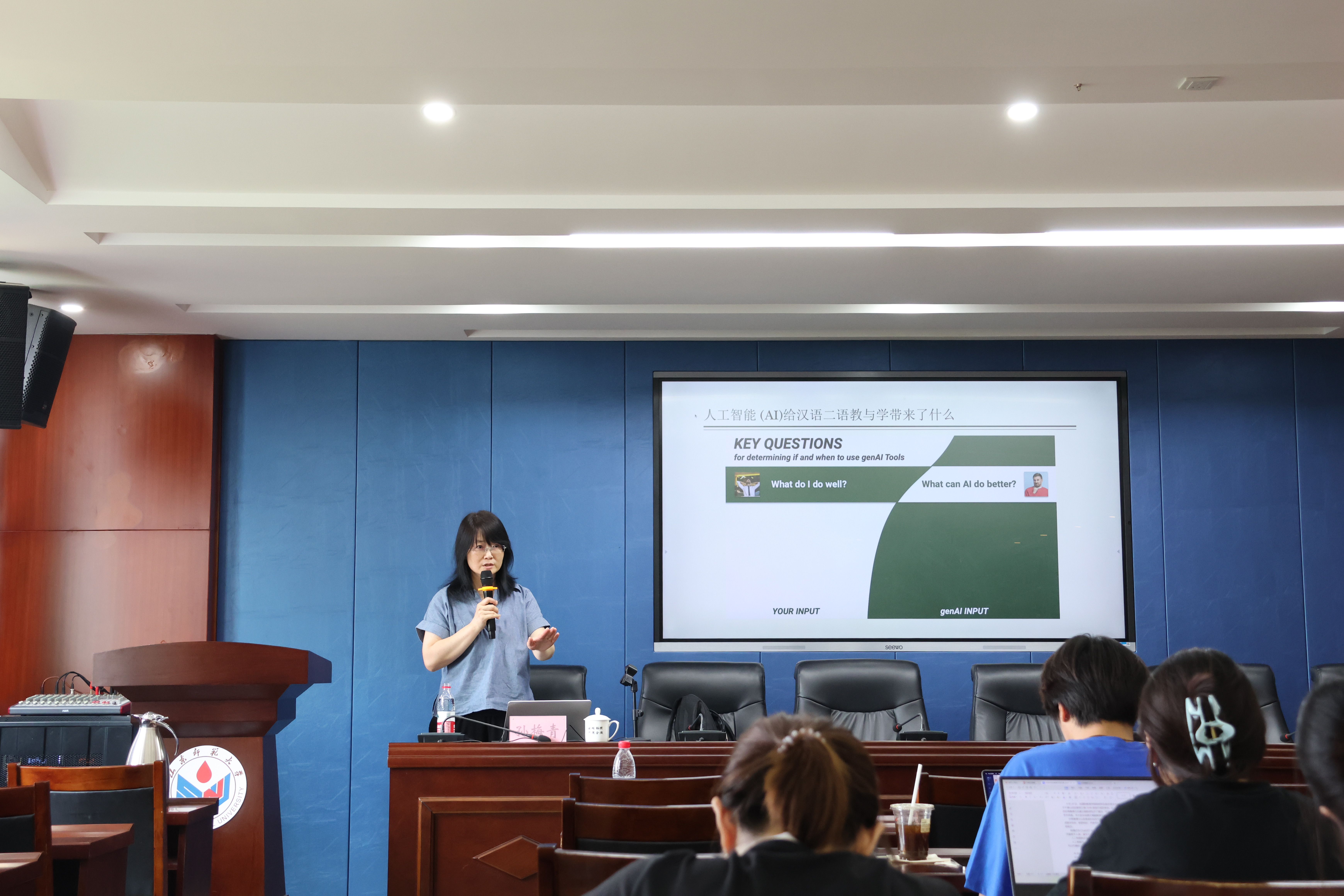 6月20日,由國際教育學院和研究生院共同主辦的“治學·修身”學術講壇于千佛山校區(qū)教學三樓3546報告廳成功舉辦。北卡羅來納大學格林斯伯勒分校的孫梅青博士應邀為我院師生作了題為“任務型教學設計如何與‘AI’俱進”的學術講座。講座由郭文娟副教授主持。