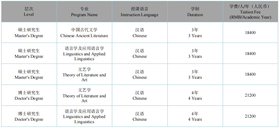 The 12 doctorate programs cover majors in Modern and Contemporary Chinese Literature,Literary Studies, Ancient Chinese Literature, Chinese Philology, Linguistics and Applied Linguistics, Comparative Literature and World Literature, Chinese Classical Philology, Curriculum and Teaching Methodology(Chinese Language), Literature and Chinese-Language Education, Literature and Film-and-TV Art, Regional Culture and Ancient Chinese literature,and Literature and Cultural-Industry Studies.The school also provides12 doctorate programs,10 academic master’s degree programs and two professional master’s degree programs.